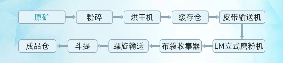 該法是將膨潤(rùn)土原礦首先經(jīng)過(guò)破碎,破碎后小于20mm的原料進(jìn)入烘干機(jī)系統(tǒng)進(jìn)行烘干,烘干后的物料進(jìn)入緩存?zhèn)}儲(chǔ)存,然后經(jīng)過(guò)皮帶輸送機(jī)送入立式磨粉機(jī)加工成100-325目級(jí)別的產(chǎn)品,后經(jīng)螺旋輸送、斗提設(shè)備后進(jìn)入成品倉(cāng)儲(chǔ)存。